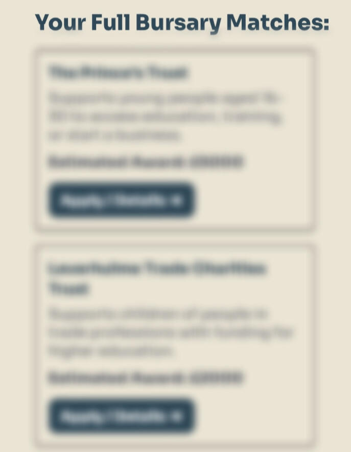 Do you apply for me?Not yet. We give links and simple tips on what to include so you can apply in minutes.What if I don’t get any matches?Unlikely, but email [email protected] and we’ll re‑run your results free and help you widen eligibility if needed.Is my data safe?Yes. Secure checkout via Stripe. We only ask what improves your matches and we never sell your data.Who is this for?UK students in higher education (undergrad/postgrad, full‑time or part‑time, mature/returning students). We also surface some options for international students studying in the UK.